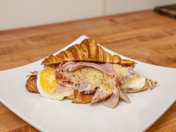 Buttery Isigny St Mère croissant, ham, and your choice of sunny-side up or scrambled eggs
