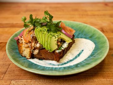 House-made pickled red onions and sun dried tomatoes with Alaskan Salmon, avocado, cucumber, cilantro, and sour cream with dill sauce