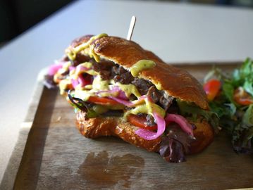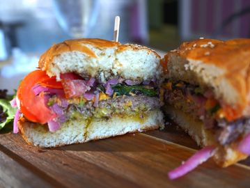 Freshly Steak grilled on a homemade bun, with tomatoes, house sauce, cheese, spinach, pickled red onions and a side salad. (Double patty $2.00 more)