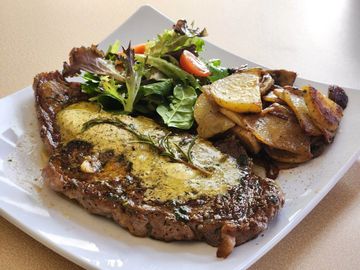 11 ounces of beef seared and based in thyme, garlic, rosemary, white wine, and butter with potatoes, mushrooms, shallots, and a side salad.