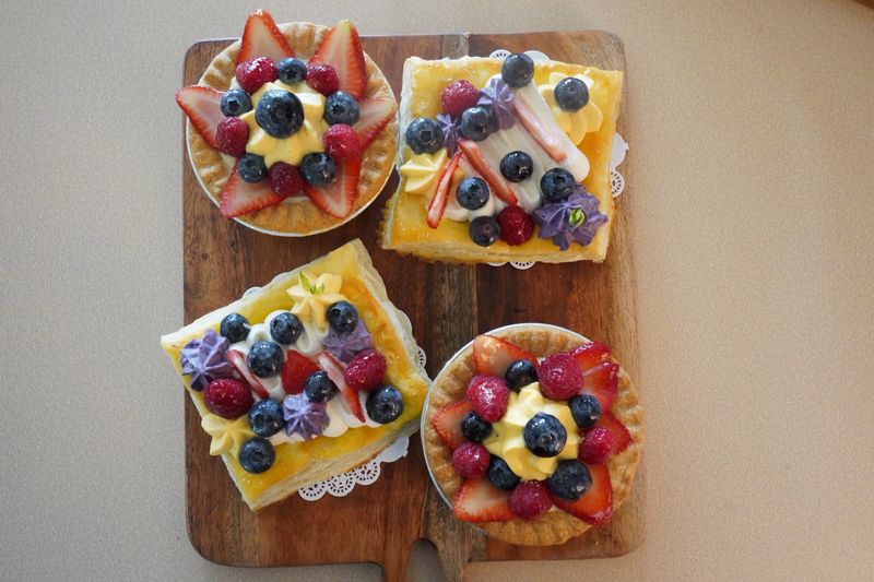 Pastry or tart filled with egg cream and fresh fruit on top.