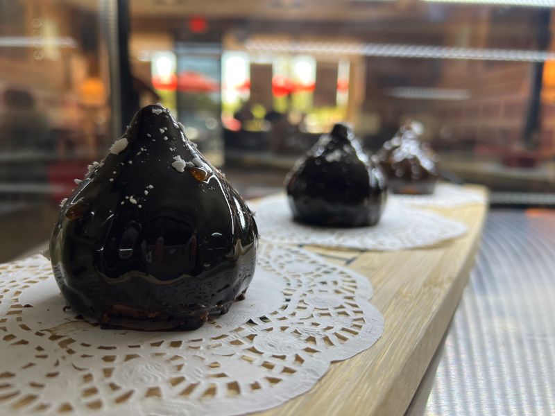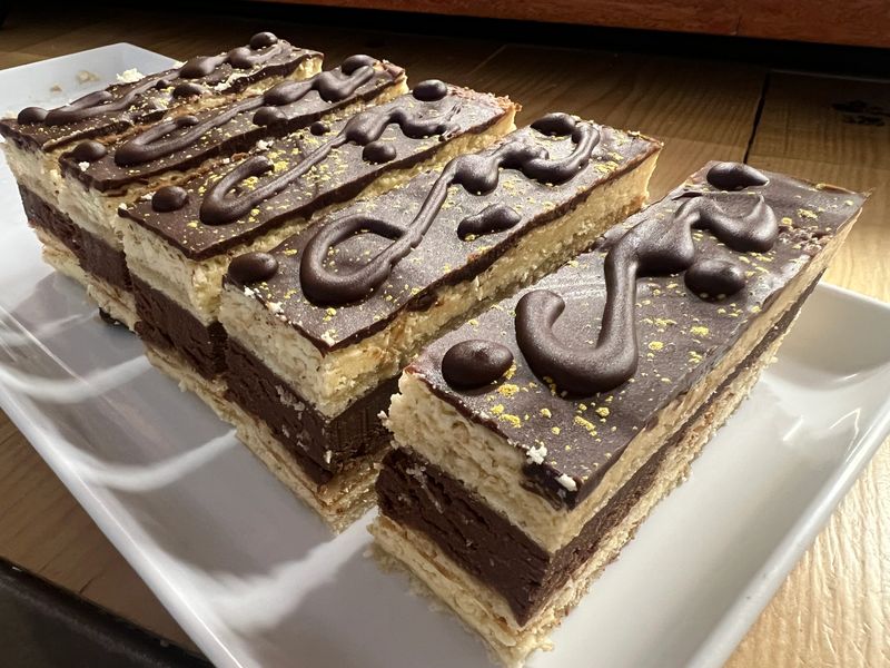 Coffee cream made from coffee beans, delicate almonds, and a deep chocolate Ganache.
