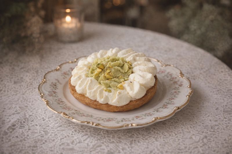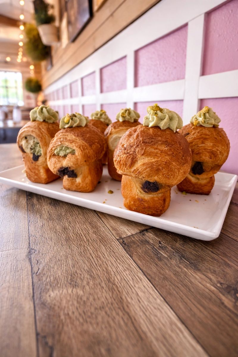 A flaky pastry filled with chocolate, pistachio, and topped with pistachio cream.